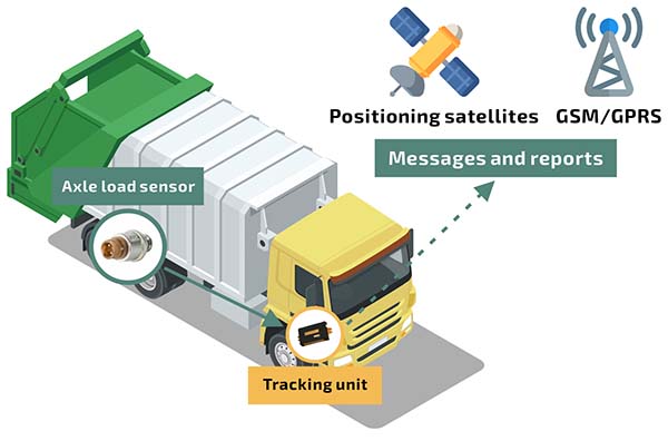 Senzor zatížení náprav předává informace o zvedání nebo snižování zatížení na nápravě terminálu. Systém sledování vozidel s pomocí GPS určuje místo a čas.