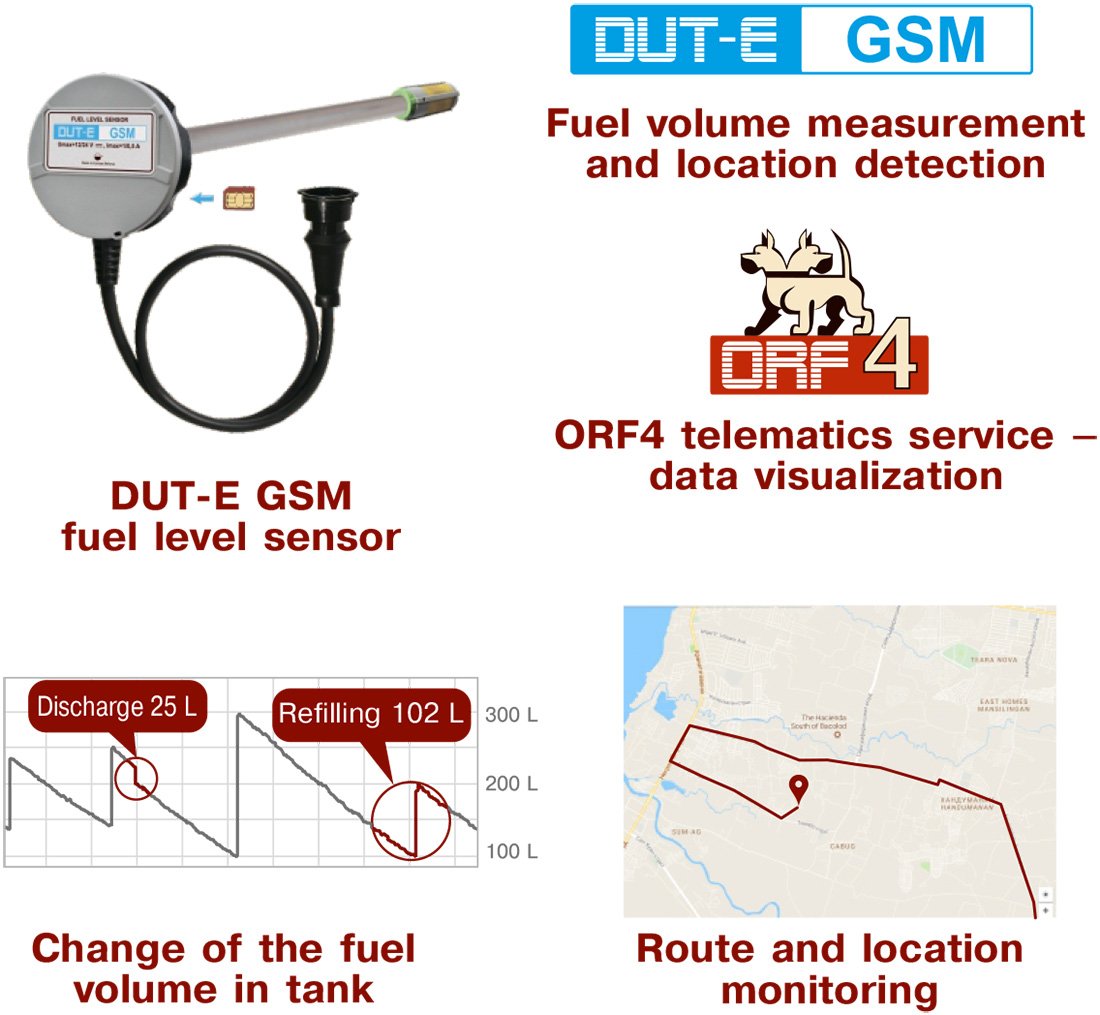 Für die genaue Überwachung des Kraftstoffvolumens, der Route und des Standorts wurden DUT-E GSM Kraftstoffstandsensoren auf den Fahrzeugen des Kunden installiert. DUT-E GSM ist ein „Zwei-in-Eins“-Gerät. Es kombiniert einen Kraftstoffstandsensor mit einer Telematikeinheit. DUT-E GSM ist einfach zu installieren und widerstandsfähiger gegen Störungen als die Standardkombination „Sensor + Terminal“. Die Sensoren messen den Kraftstoffstand im Tank mit hoher Genauigkeit (Fehlerquote nur 1%). Die Füll- und Abflussmengen aus dem Tank werden in Echtzeit gemessen und gemeldet. DUT-E GSM erkennt den Standort des Fahrzeugs und sendet folgende Daten an den Computer des Flottenbetreibers: