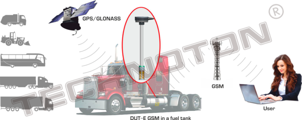 La soluzione ideale sarebbe quella di avere un sensore che non richiede un localizzatore GPS esterno, che ha un tracker al suo interno. Pensiamo di aver fatto questo: il nostro nuovo prodotto, DUT-E GSM, che misura livello del carburante e anche ha moduli GPS e GSM all'interno.