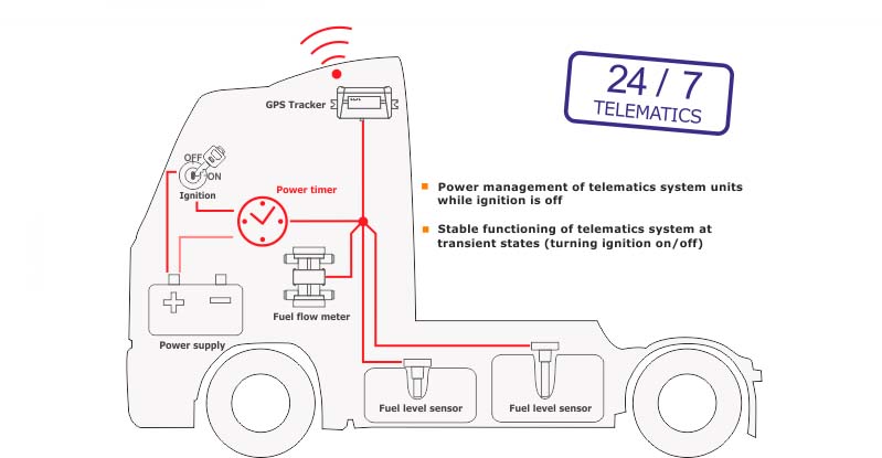 Power timer PT-01 provides both – when vehicle is off, device will switch on power supply to telematics devices for a short period of time, so that all devices could send their data to tracking device, which would, in turn send it back to the server, providing continuous supervision over the vehicle and additional equipment, like fuel level sensors, axle load and any other valuable sensors on board.